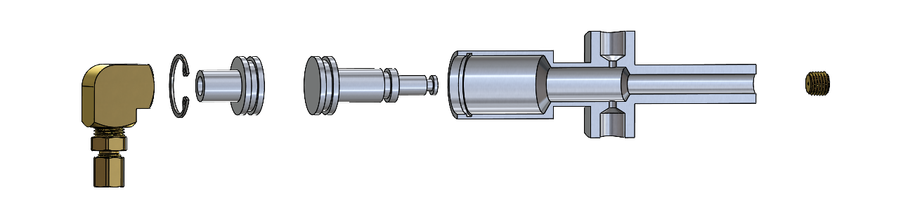 During filling of the oxidizer tank, nitrous oxide vapor will be allowed to escape through a static vent port, just like in almost all amateur hybrids as well as the Half Cat engine. But rather than a simple fitting with a small hole, the static vent is part of a fluid pressure-actuated valve, which is connected to part of the main oxidizer valve. While the tank is being filled, the pressure of the escaping nitrous vapor will be holding the vent valve piston in the open position; at this time, there is no force trying to close the valve. When the main oxidizer valve is opened, however, pressure will enter the inlet on the side of the vent valve where it acts on the larger diameter end of the piston. Because pressure from the main oxidizer valve is acting on a larger area than the pressure from the escaping nitrous vapor, the piston will be pushed into its closed position, even though the pressure on both sides is the same. When the engine is done firing and the spring return closes the main oxidizer valve, there will no longer be any pressure acting on the large end of the piston. The pressure on the small end will push it back into the open position, venting the remaining pressure in the oxidizer tank.